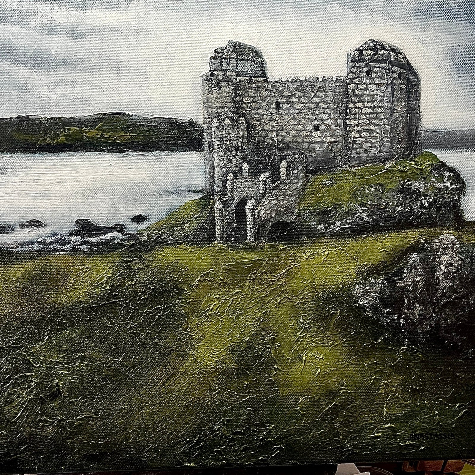 Anniversary gift painting of castle ruins reconstructed to re-imagine a wedding location.