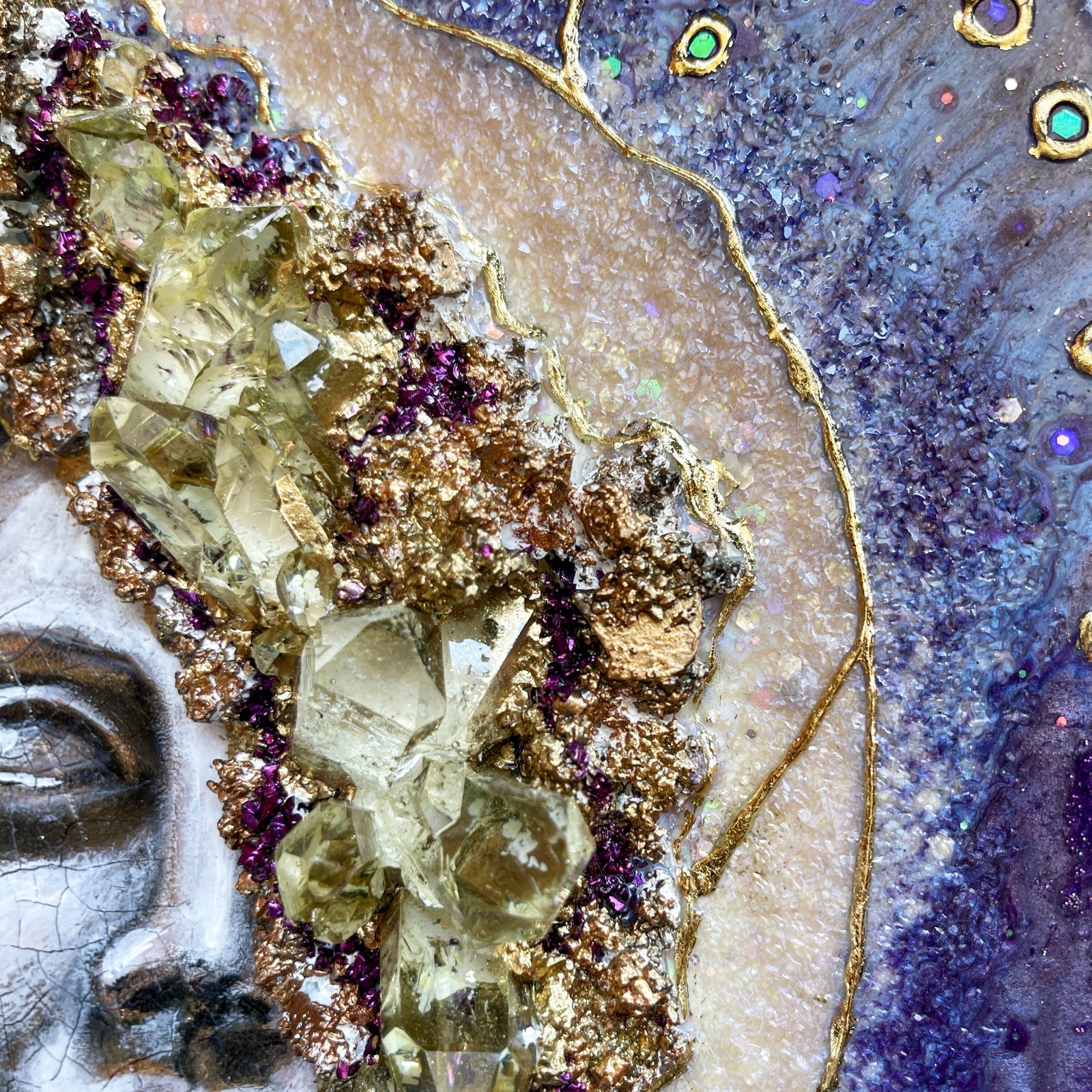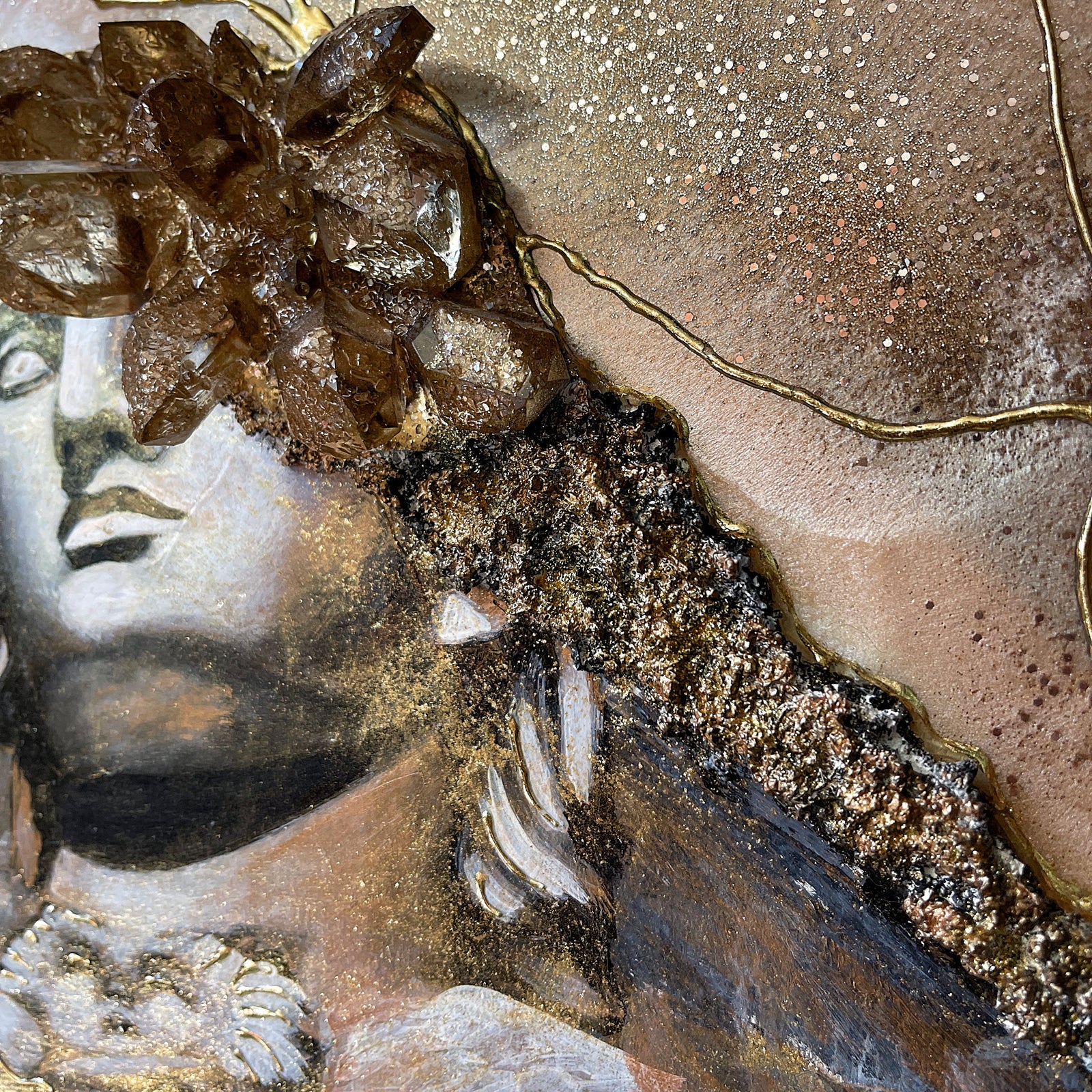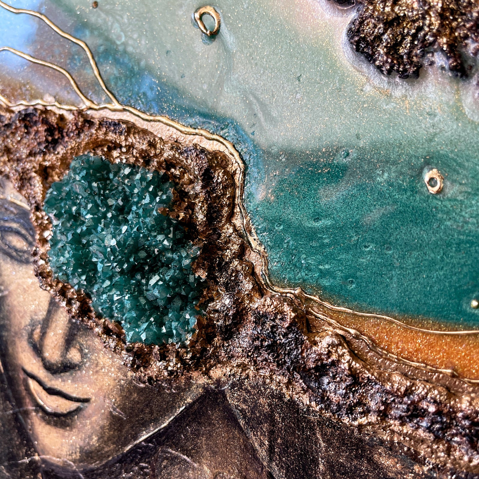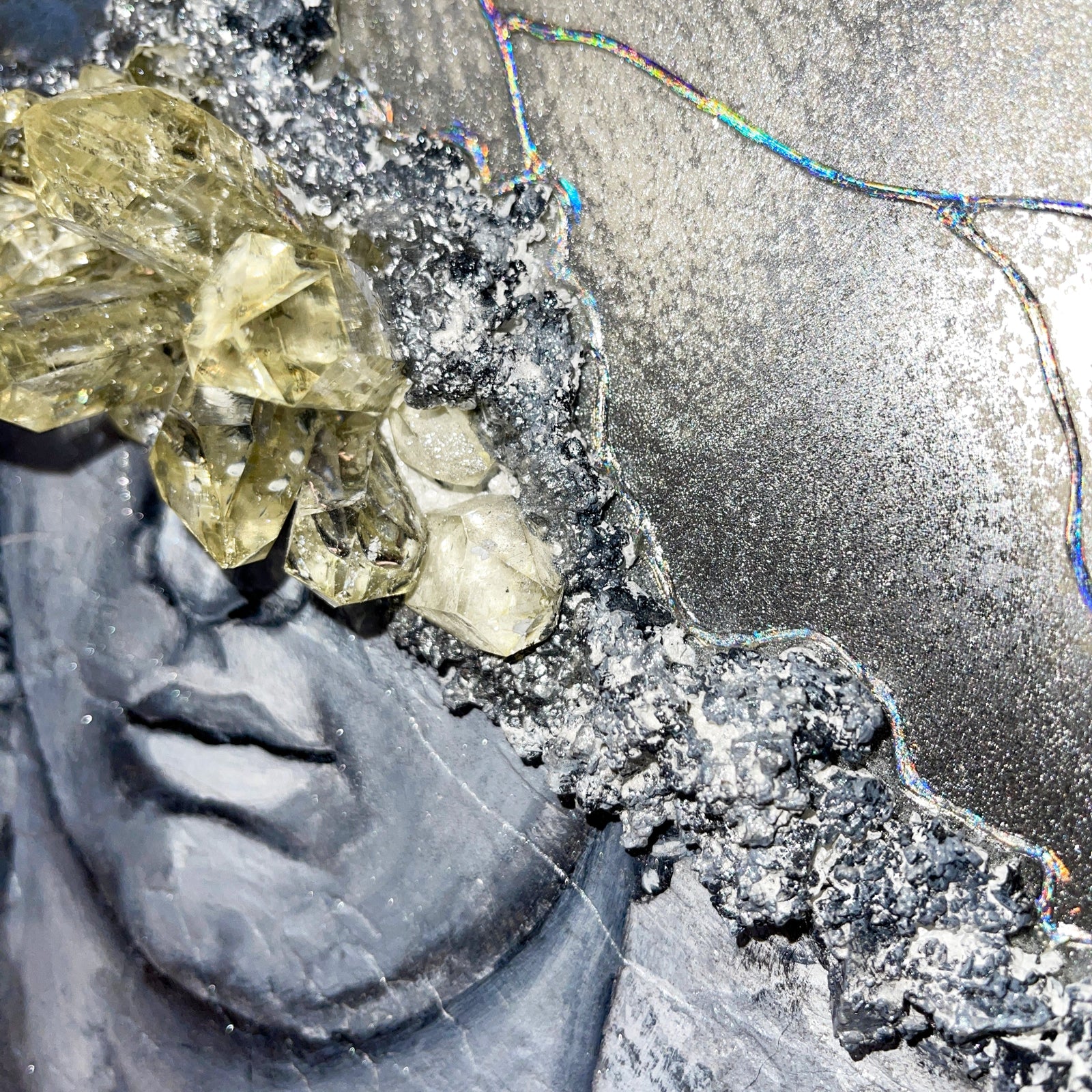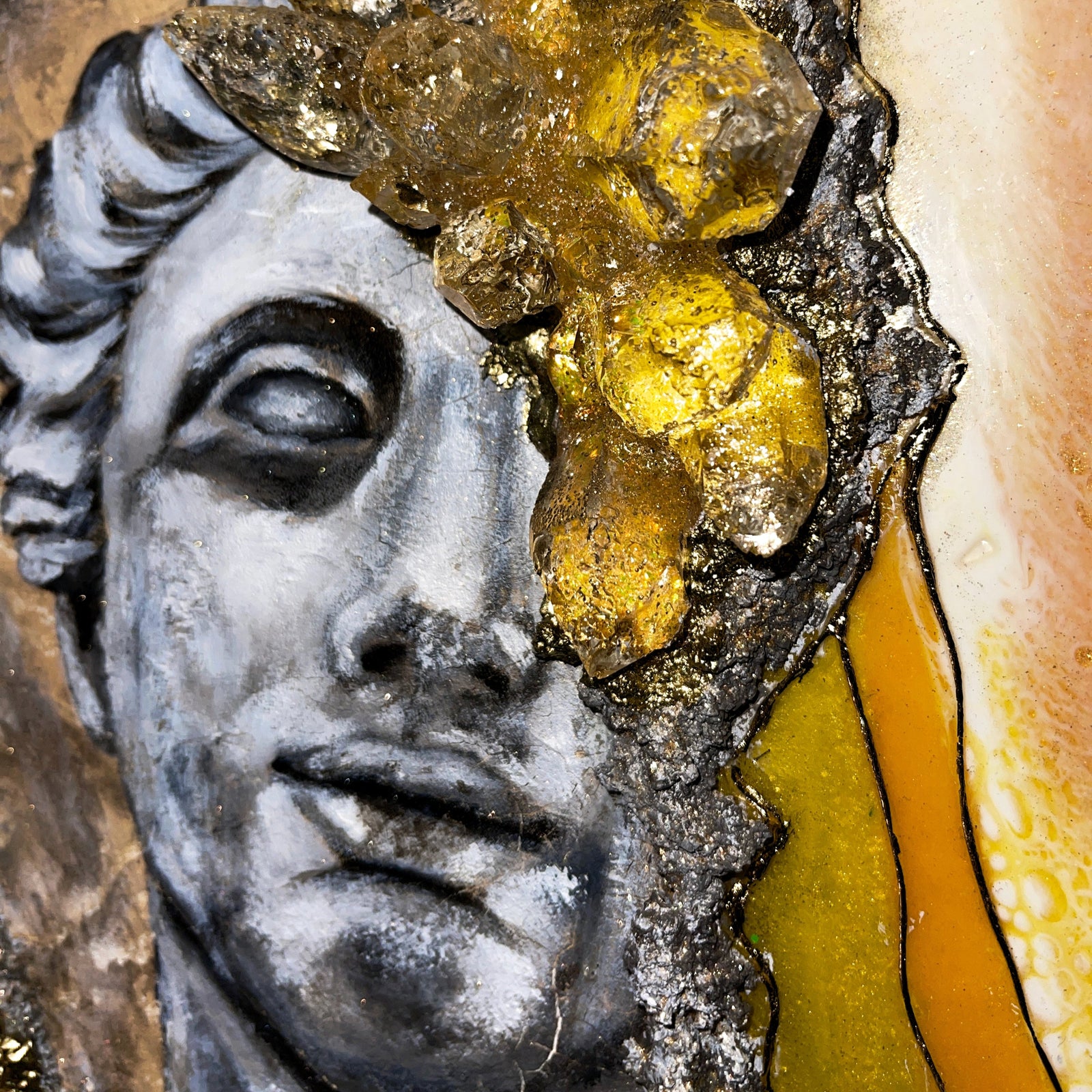 The Monumental series is a reimagining of ancient statues — fragmented, weathered, and incomplete, yet still strikingly powerful. Through layers of flowing resin, gold leaf, and crystal, the series bridges the sacred and the modern, celebrating resilience and rebirth.