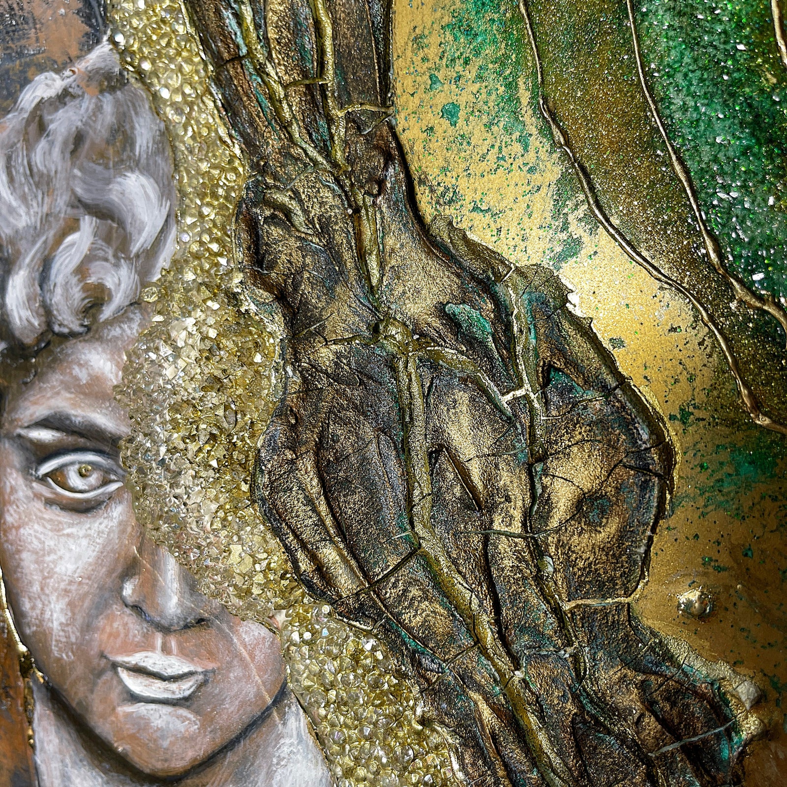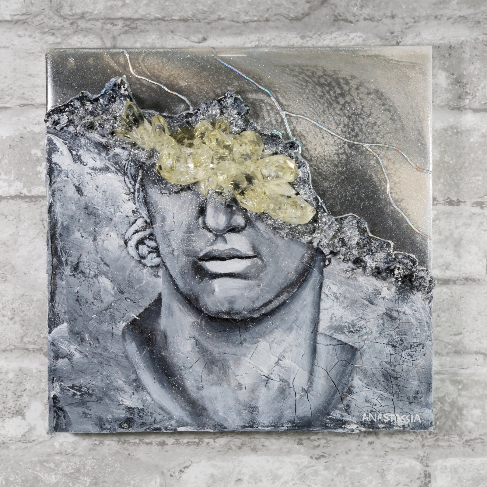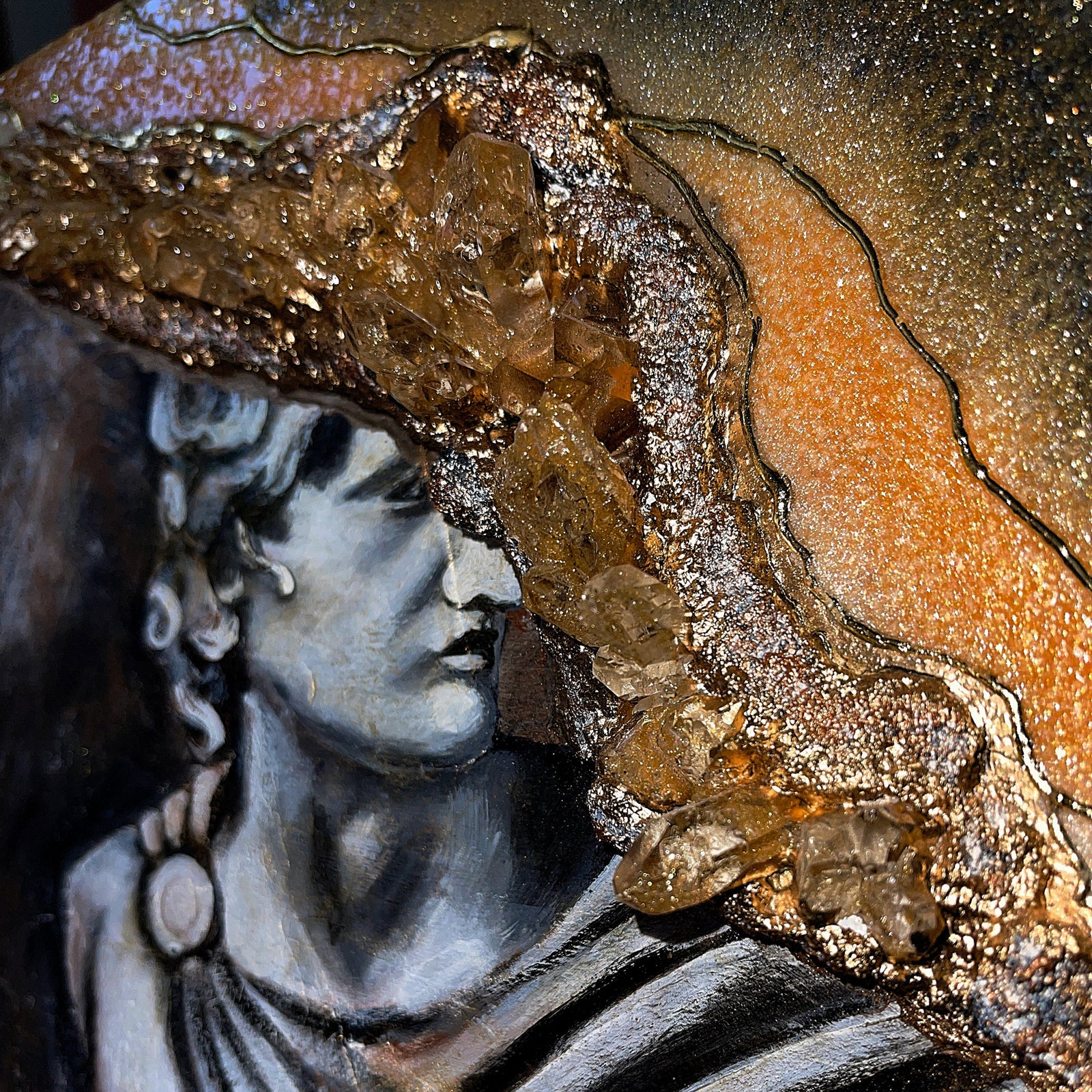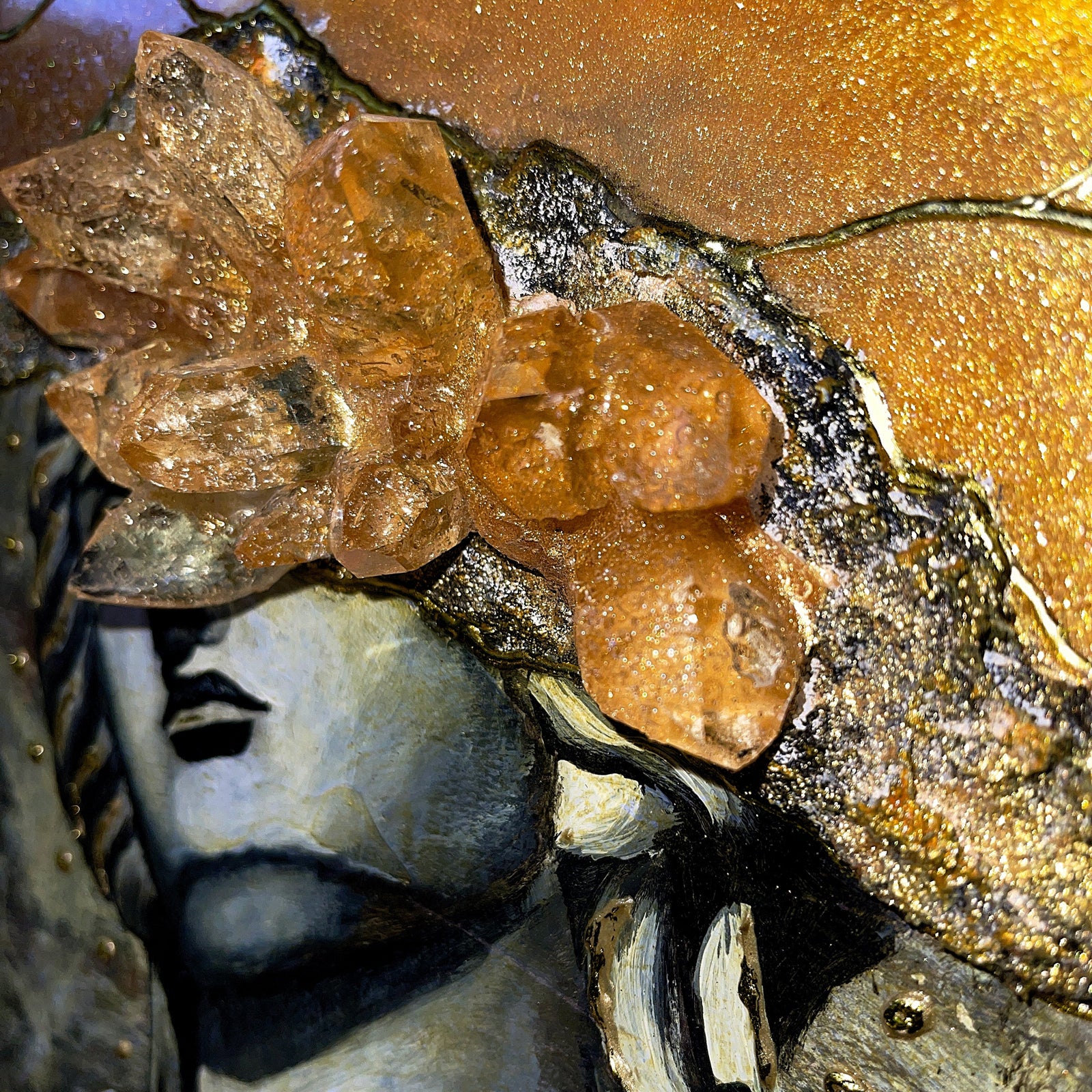The Monumental series is a reimagining of ancient statues — fragmented, weathered, and incomplete, yet still strikingly powerful. Through layers of flowing resin, gold leaf, and crystal, the series bridges the sacred and the modern, celebrating resilience and rebirth.